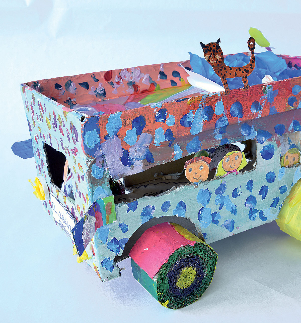 I pulmini realizzati dai bambini si muovono allegri sulle loro quattro ruote; hanno tetti trasformati in terrazze oppure con scivoli che portano direttamente in piscina.